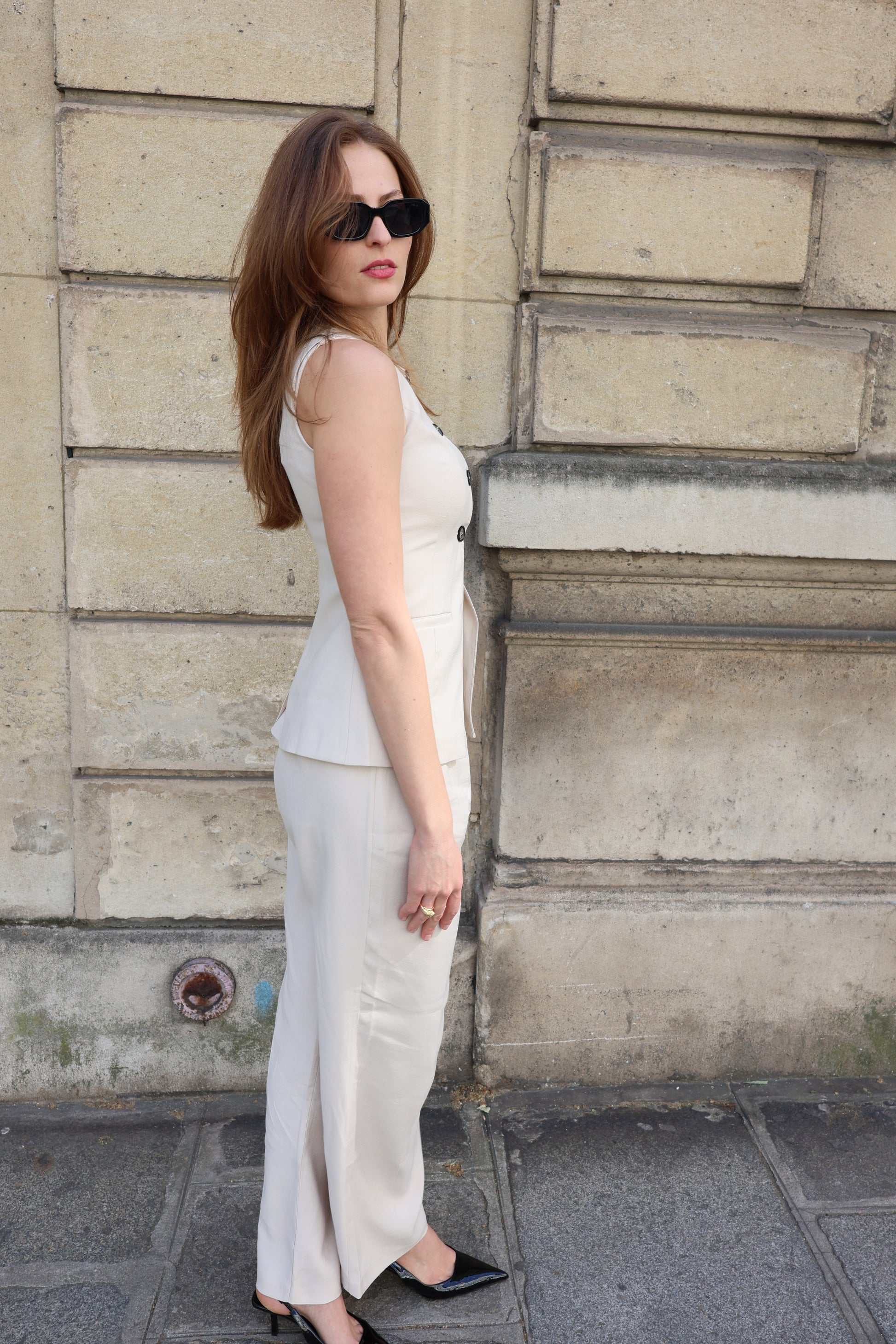 L’ensemble tailleur Alma, un classique original, se distingue par sa simplicité et son style raffiné. Il comprend un gilet sans manches associé à un pantalon droit, offrant un confort optimal tout en incarnant une élégance discrète et intemporelle.
