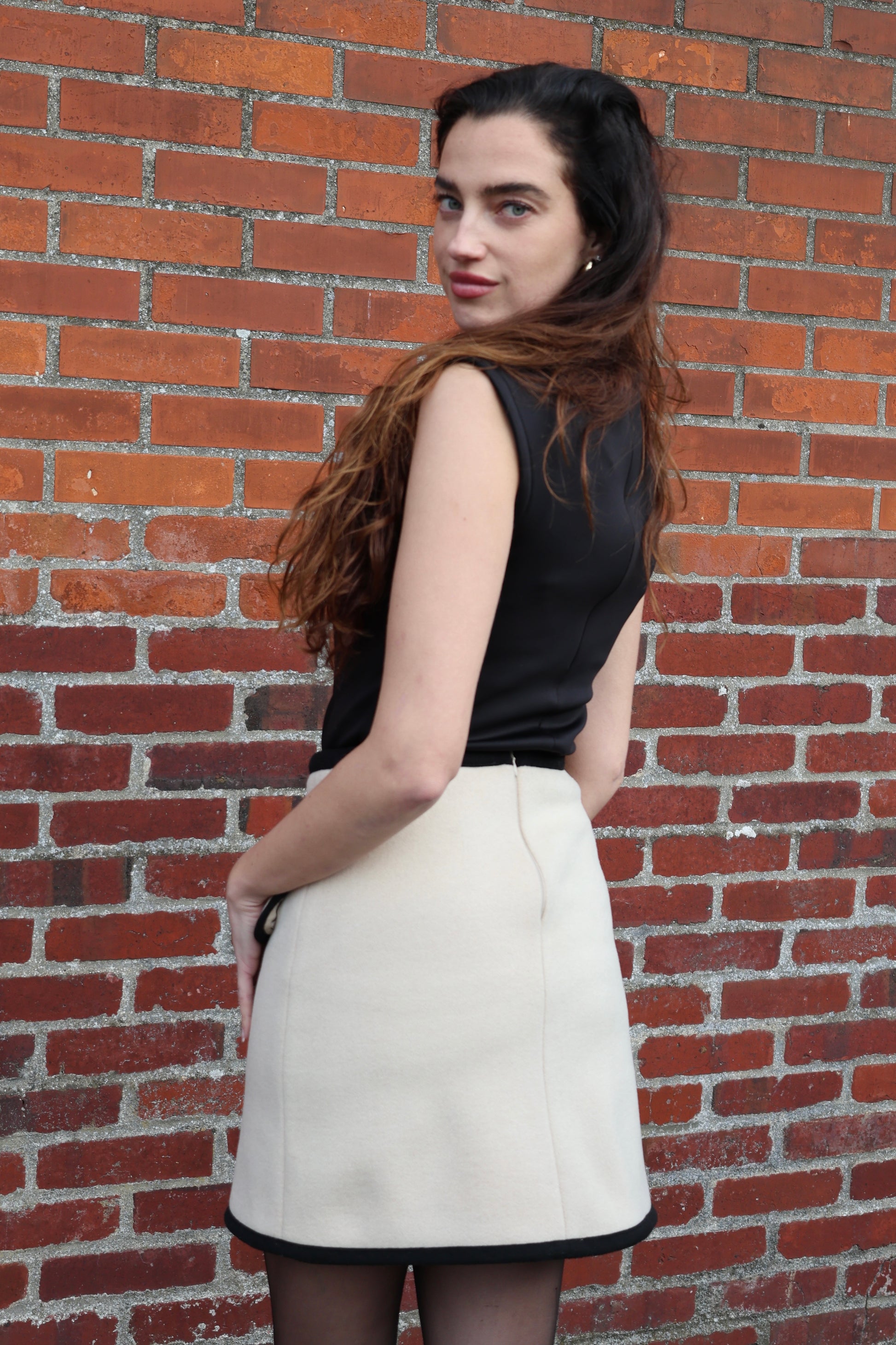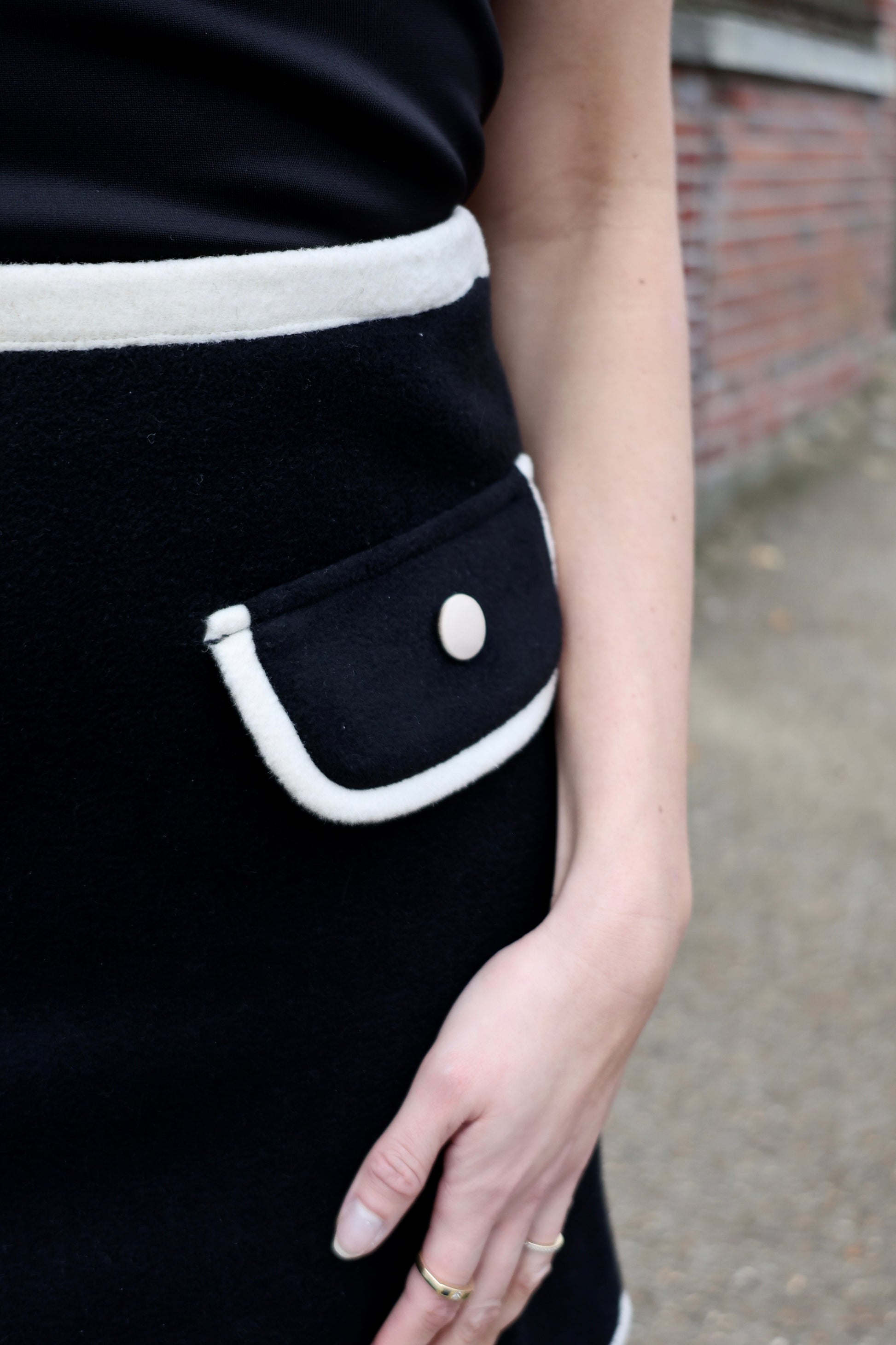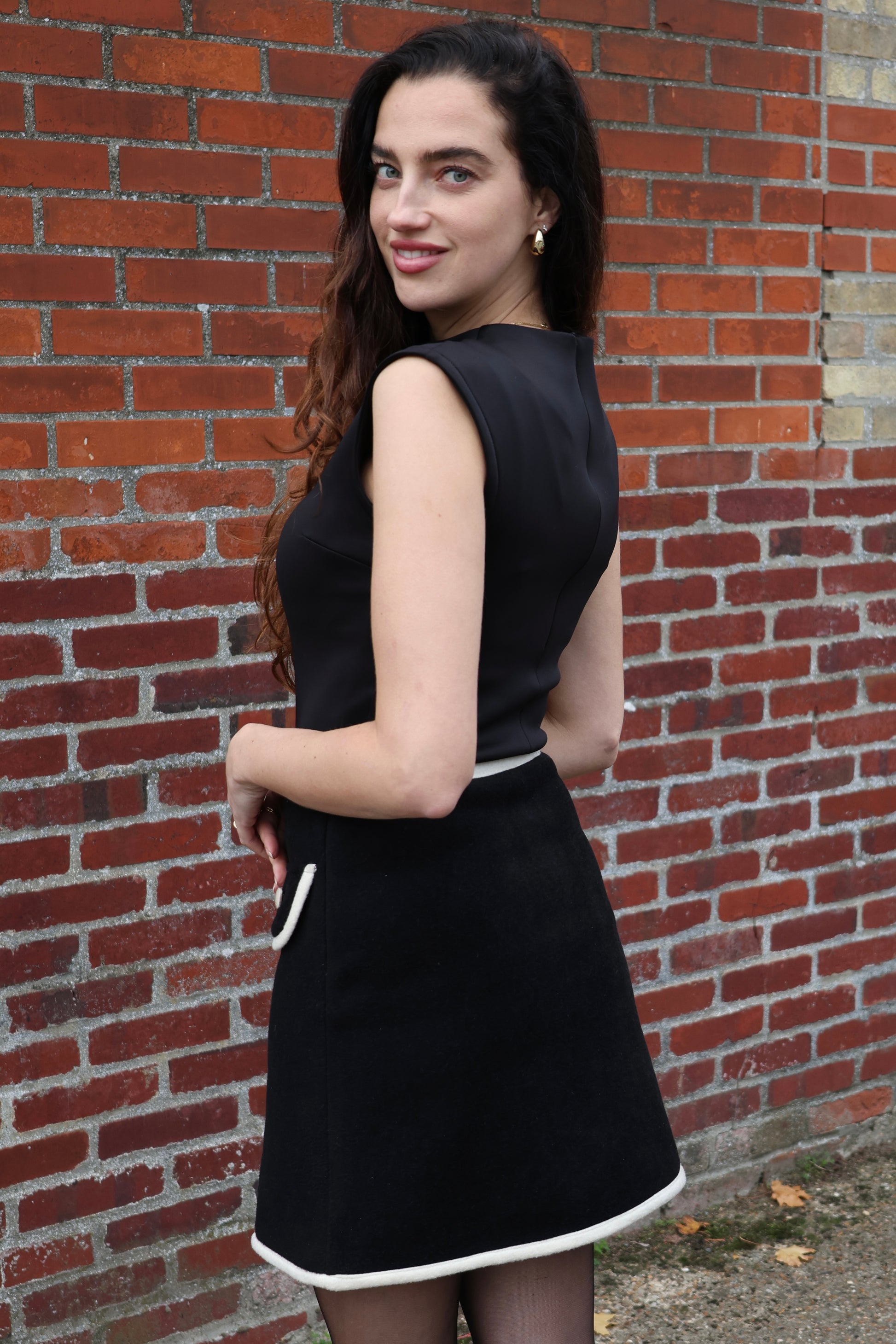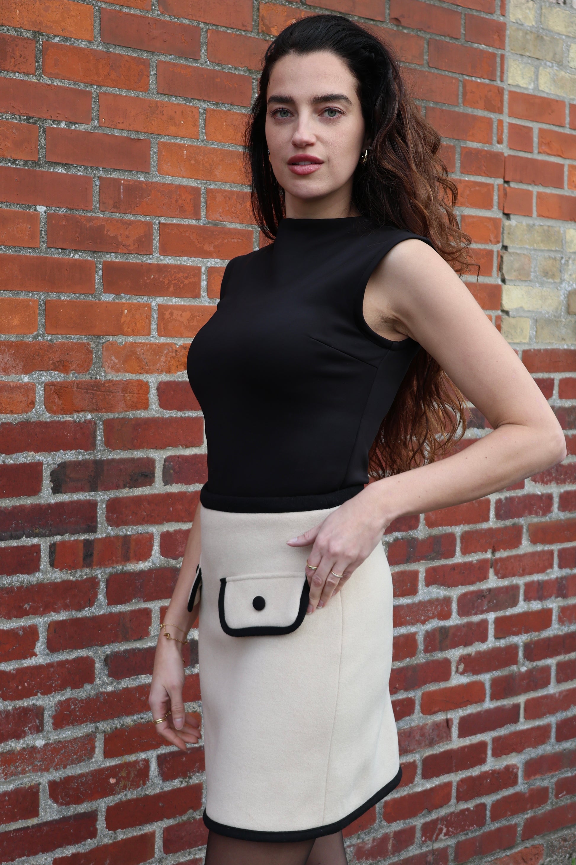La Jupe Courte Mima allie élégance intemporelle et sophistication subtile. Sa coupe féminine et structurée crée une silhouette parfaitement équilibrée, tandis que les détails raffinés — fausses poches à rabat, boutons recouverts en tissu et fermeture zippée cachée à l’arrière — témoignent d’un travail minutieux et luxueux. Une pièce originale et sophistiquée, idéale pour un look effortless, chic et résolument statement.
